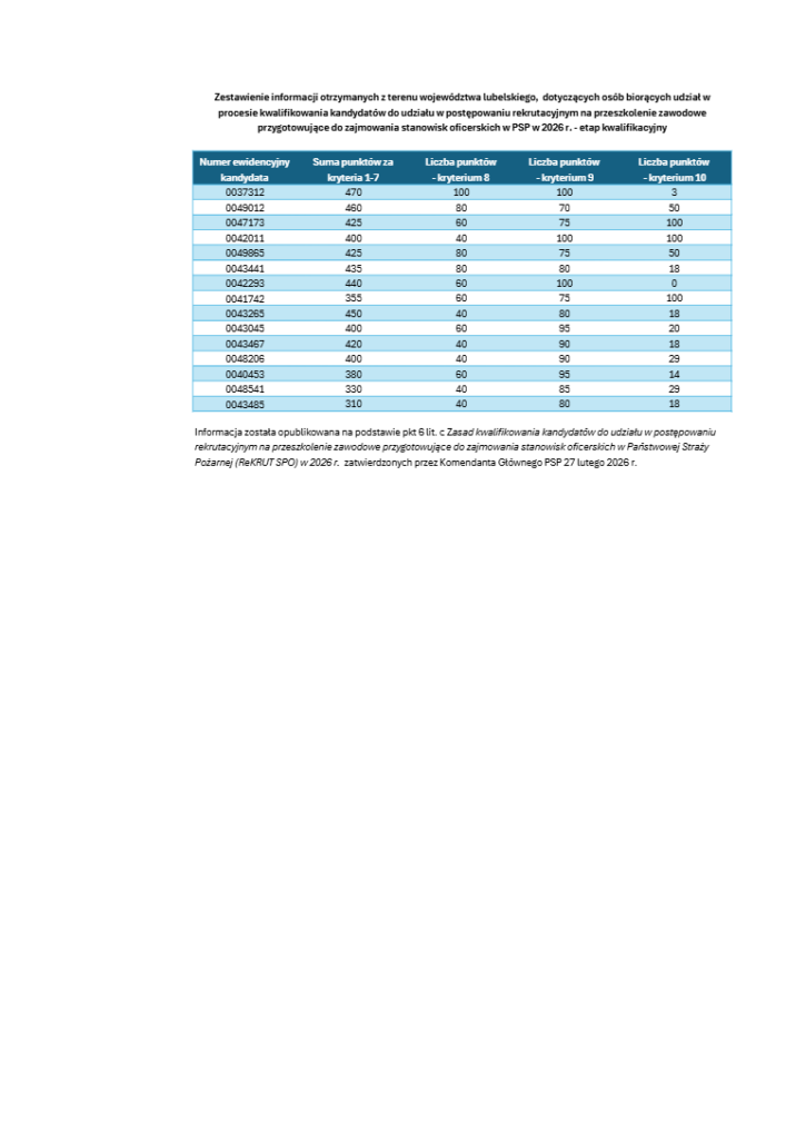 Informacja została opublikowana na podstawie pkt 6 lit. c Zasad kwalifikowania kandydatów do udziału w postępowaniu rekrutacyjnym na przeszkolenie zawodowe przygotowujące do zajmowania stanowisk oficerskich w Państwowej Straży Pożarnej (ReKRUT SPO) w 2026 r. zatwierdzonych przez Komendanta Głównego PSP 27 lutego 2026 r.